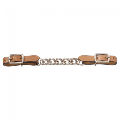 Only 1 left!Heavy import leather curb strap with nickel-plated single dual link flat chain center. Features fully adjustable square buckle ends with 3 holes on...