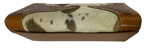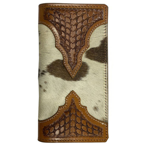 Only 3 left!This long bi-fold wallet has a western style featuring a medium oil basket stamped leather design with a hair on cowhide inlay. These wallets are m...