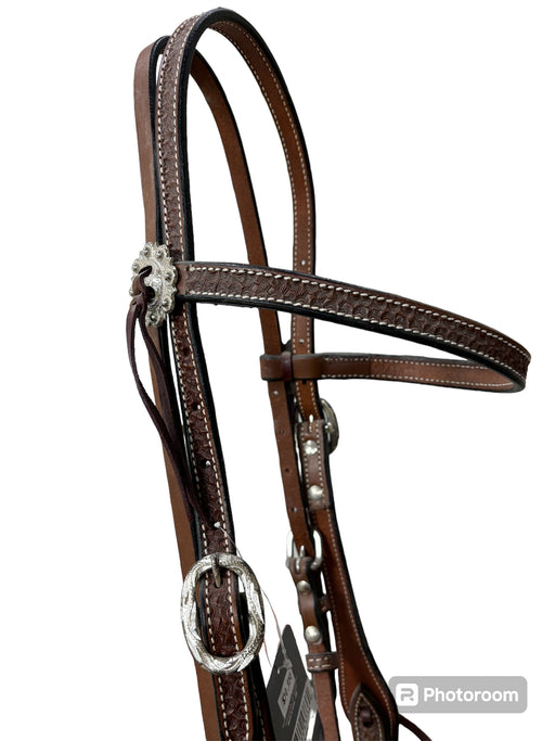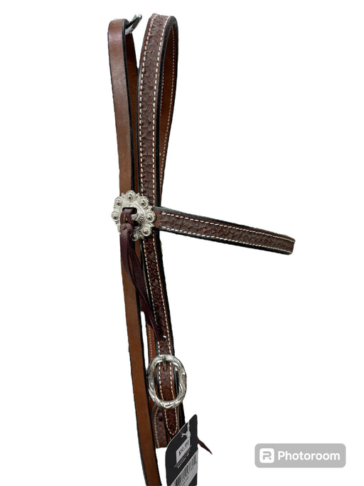 Tough-1 Leather Straight Brow Headstall - Basket Stamp w/ Silver Hardware