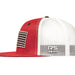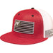 Ropesmart's classic trucker snapback with American Flag patch; Red crown, red flat bill with white mesh