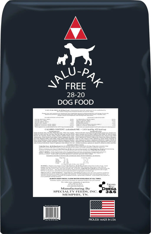 5+ in stockValu-Pak Free 28-20 Dry Dog Food (Black Bag), 50 lb Valu-Pak Free 28-20 is high-protein, high-fat dry dog food made for active dogs and puppies. Th...