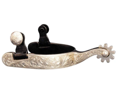 Out of stockShowman ® brown steel spur with 1" band and 2.5" shank. Details are engraved silver scrolling and rhinestones. Made by Showman ®Products.