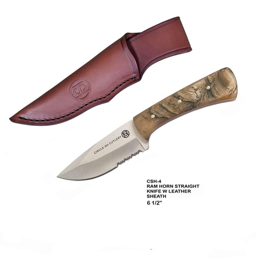 CIRCLE SH KNIFE, STAINLESS STELL BLD/ RAM HORN HANDLE / LTHR SHEALTH