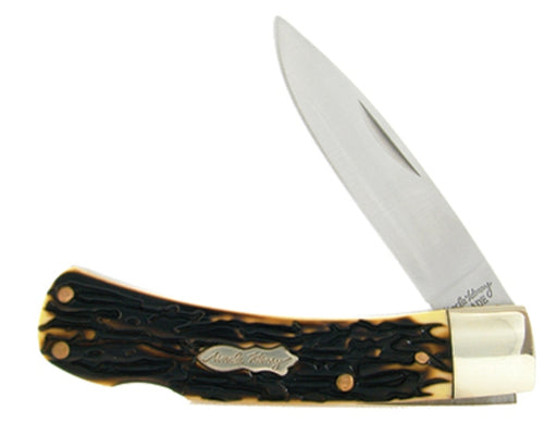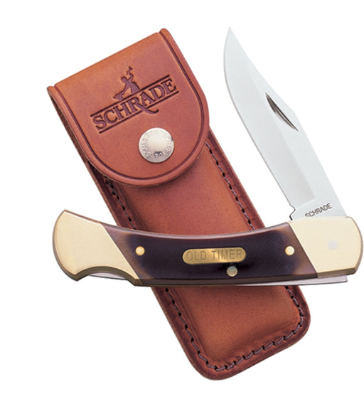 Only 3 left!Cave Bear Old Timer Knife, high carbon steel locking clip blade, Delrin handle, 5" closed lockback design. Imported. Genuine leather sheath.
