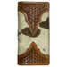 This long bi-fold wallet has a western style featuring a medium oil basket stamped leather design with a hair on cowhide inlay. These wallets are made with numerous card slots, ID window, and longer compartments for cash or checkbooks.  Measures 7 1/2" x 3 3/4".